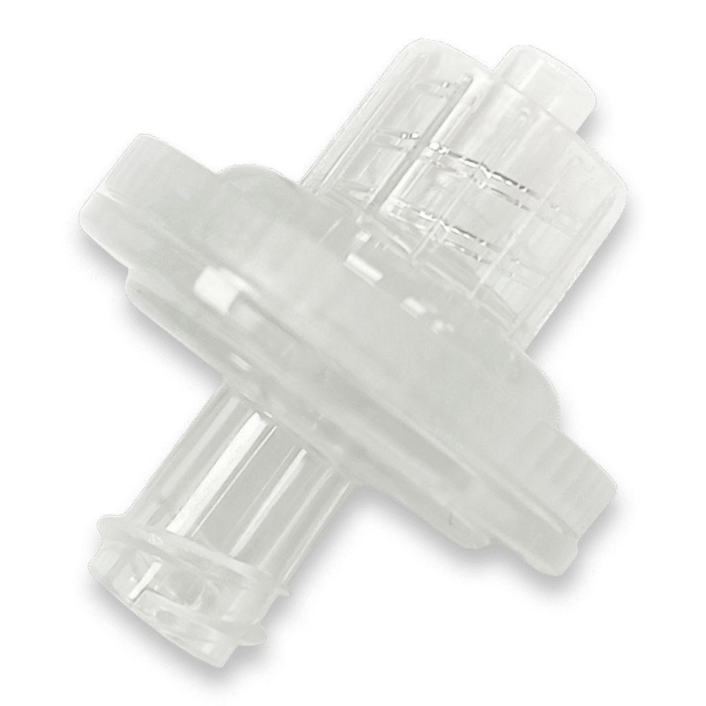 Material: Carcasa (Housing): PVC semi-rígido (grado médico). Membrana de Filtro (Membrane): PTFE (e.g., GORE™ Medical Membrane). Tamaño de poro: 0.2 μm.