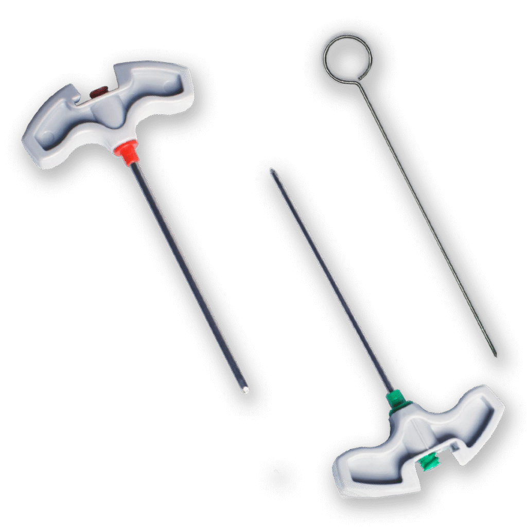 Aguja especialmente diseñada para Biopsia de Médula Ósea y aspiración de parte de la misma, con criterio diagnóstico. Mango de diseño anatómico a los efectos de facilitar y dar máxima seguridad en las maniobras de punción. Se incluye en el set, una varilla extractora de la muestra del interior de la aguja con un protector para evitar heridas en el operador en el momento de la extracción.