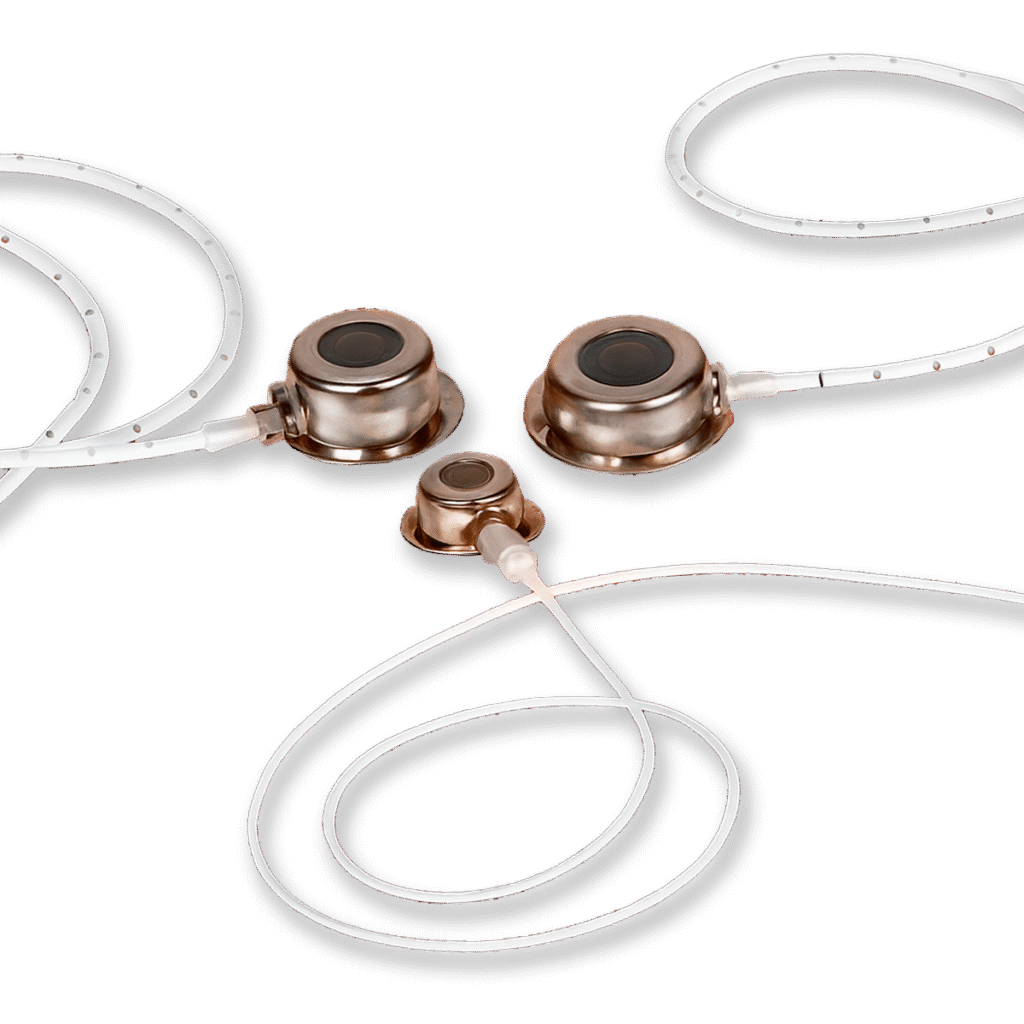 Sistema implantable para la administración de fármacos construido en titanio. Esto hace a este portal extra-liviano, de máxima resistencia y absoluta biocompatibilidad. Su septum autosellante de silicona, permite más de 1000 punciones con agujas de punta tipo Huber (G21) sin que se produzcan pérdidas.