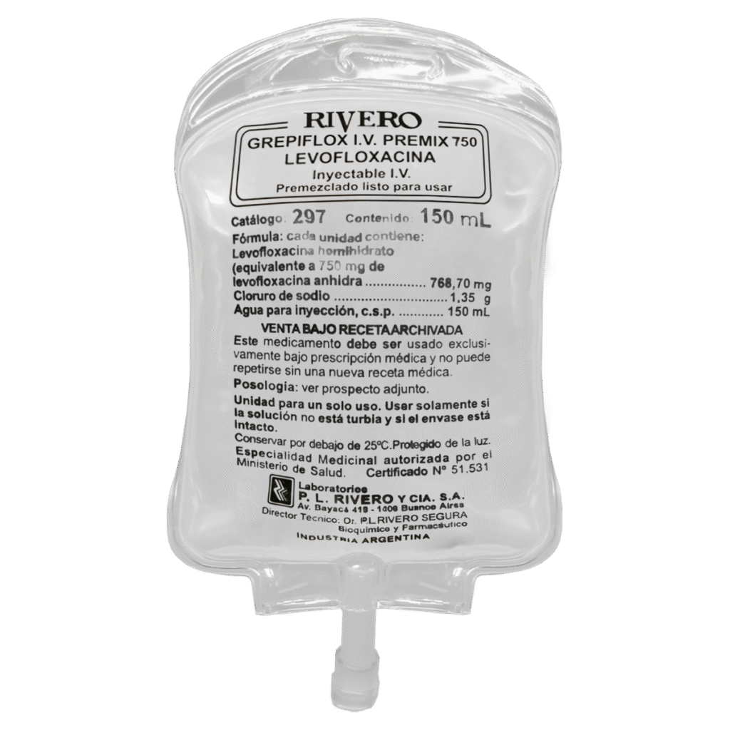 Composición: Levofloxacina 750 mg (generalmente en 150 ml).